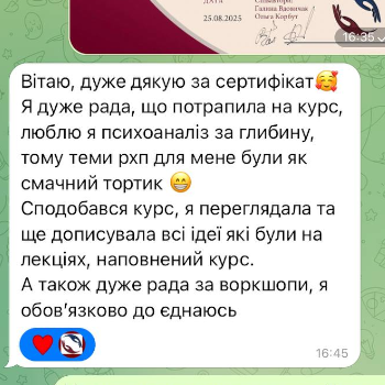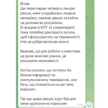 - Сертифікована спеціалістка в роботі з не-невротичними пацієнтами в методі клінічного психоаналізу